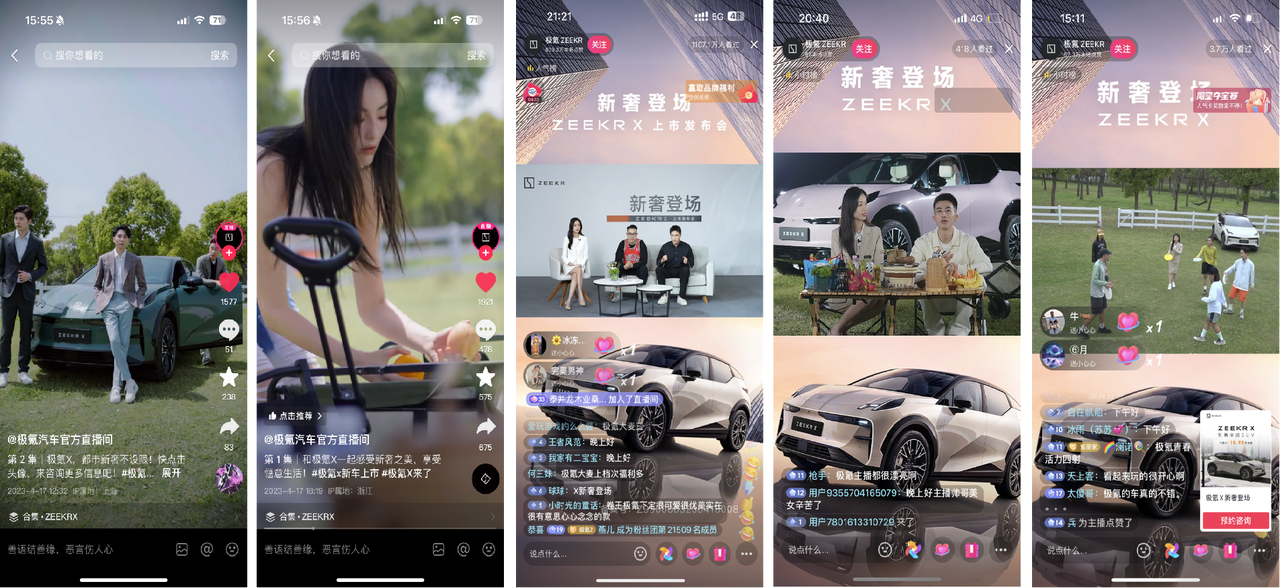 日播与品牌事件组合拳是极氪场景化营销的重要策略。团队借势 Zeekr001FR 发布、Zeekr007 发布、上海车展、广州车展等热点事件打造主趣门店直播间,实现流量突破,持续扩大品牌声量。在热点事件期间,通过场景化直播的形式,将事件热度与产品卖点结合,如在上海车展期间,打造 “车展同款场景直播”,让用户足不出户即可感受车展氛围,同时深入了解极氪车型的参展亮点。