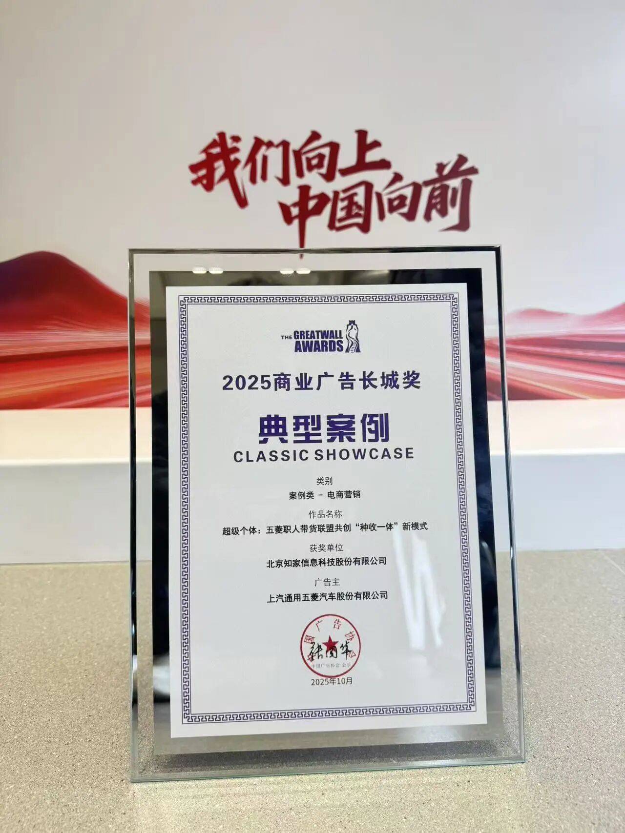 2025 年 10 月,第 32 届中国国际广告节在北京落幕,被誉为 “行业奥斯卡” 的长城奖获奖名单重磅揭晓。由知家 DTC 深度操盘、与五菱汽车联合打造的《超级个体:五菱职人带货联盟共创 “种收一体” 新模式》案例,凭借深刻的用户洞察、体系化的运营架构与卓越的商业成果,从数万件参赛作品中脱颖而出,成功摘得长城奖 “电商营销典型案例” 殊荣,以行业权威认可印证了 “用户即渠道” 营销模式的突破性创新价值与实践力量。