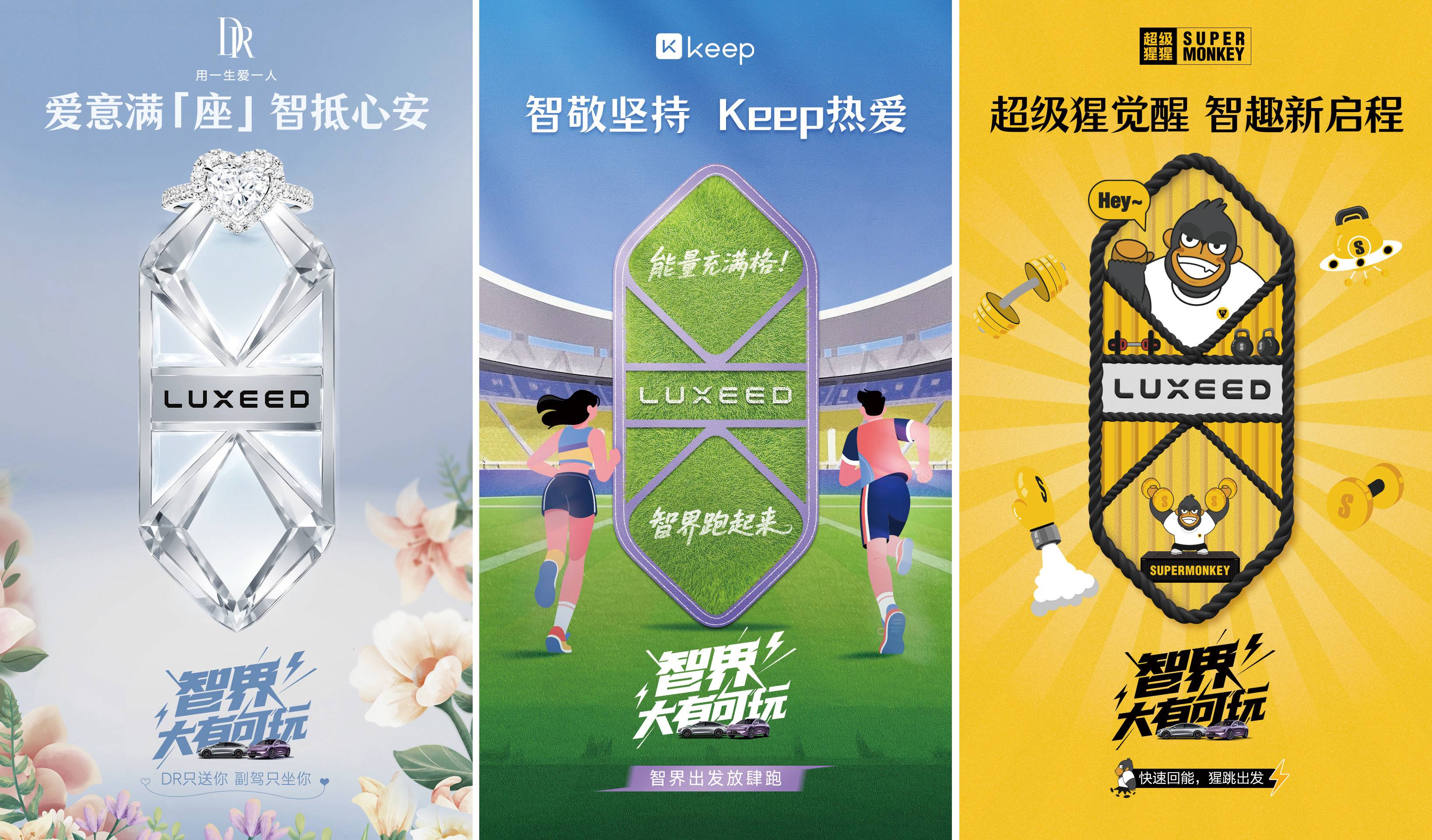 采用 “AI 生图 + 人工优化” 的混合生产模式,AI 产出占比达 70%-75%,显著提升了内容生产效率。一方面,通过 AI 工具调教,将智界 “X” 符号与合作品牌核心视觉元素智能融合,例如将 KEEP 的紫色跑道填充为 “X” 的内部纹理,将中国邮政的公路元素转化为 “X” 的轮廓线条;另一方面,根据合作品牌核心场景,AI 一键生成适配的背景素材,如马蜂窝的旅行风景图、德芙的薄荷叶凉感画面、超级猩猩的运动场景等,无需人工逐一绘制;同时,通过 AI 色彩校准技术,确保 15 张联动海报在色彩、版式上保持统一性,同时保留各品牌的视觉辨识度,让“X"不再局限于LOGO本身,而是成为连接不同圈层的文化载体,最终实现从行业破圈到用户心智占领的跃迁。