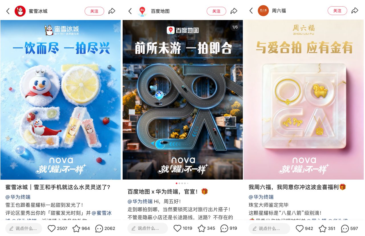 1、跨域资源整合,实现生态破圈:打破行业与品牌边界,联动食品、珠宝、出行、潮玩等多品类10家优质蓝V品牌,构建“品牌+平台+用户”的多元生态联动体系。不仅实现粉丝资源互通、流量叠加,更借助不同圈层的用户群体,让华为nova的品牌符号与年轻态度突破单一圈层限制,从手机行业延伸至更广泛的年轻消费场景,让星耀标符号与品牌理念触达更多潜在用户,破解传统营销的圈层壁垒。