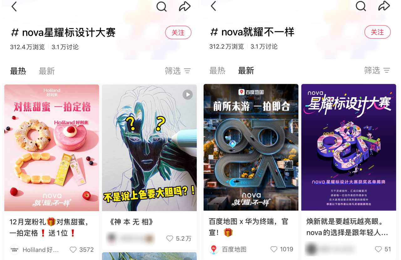 围绕#nova星耀标设计大赛#、#nova就耀不一样#两大核心话题展开传播,全网曝光量突破310万+,话题讨论量累计3万+;联动官方及蓝V账号发布内容15条(覆盖微博、小红书),累计阅读量180万+,互动总量(点赞、评论、转发)达6万+。