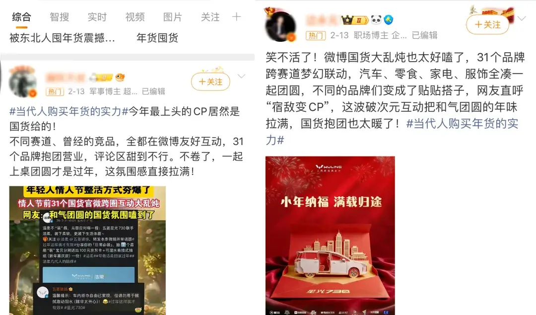 两大话题的传播,不仅实现了品牌声量的破圈,更将星光730的产品定位与“国货团圆”的情感内核深度绑定。借助五菱过往深厚的国货品牌人脉,30家国货品牌的联动从蓝V矩阵升级为全民围观的国货社交现象,星光730的“大空间”不仅是产品优势,更成为承载亲情、友情、年味的“关系场”情感隐喻,让用户在感受国货团圆氛围的同时,深度记住了星光730的产品特性,实现了从“品牌曝光”到“用户心智植入”的跨越。