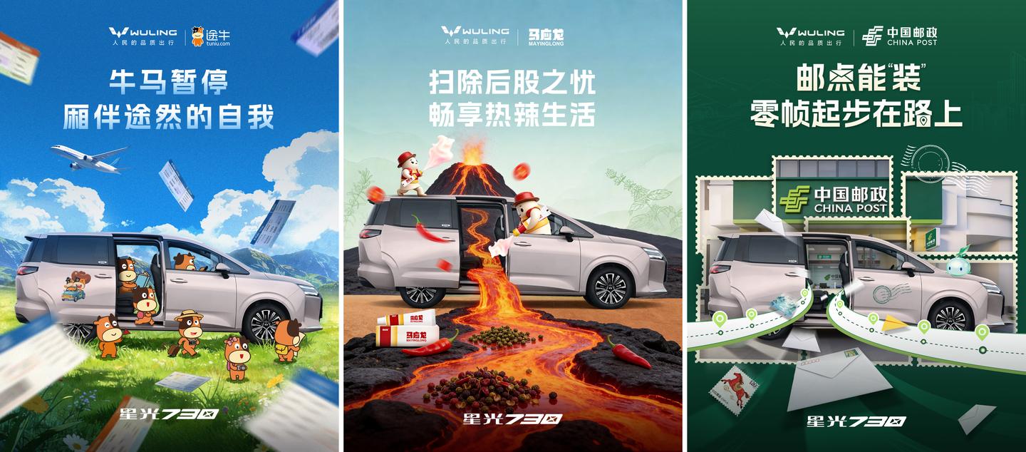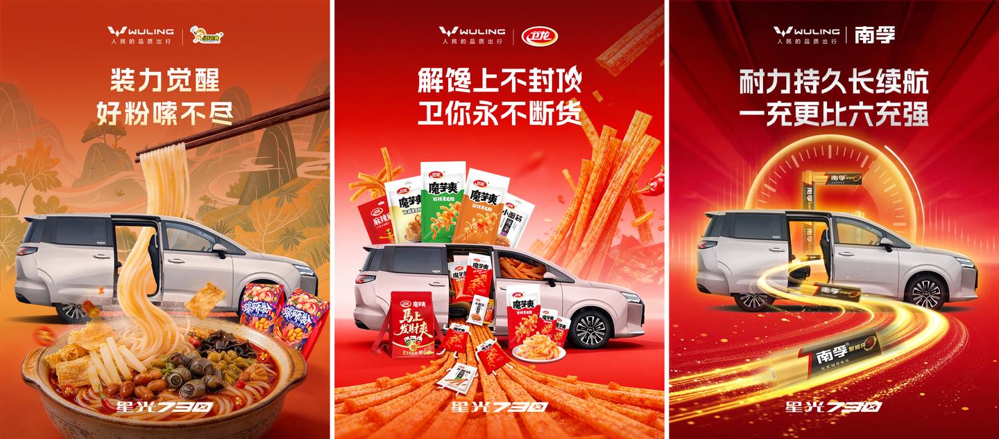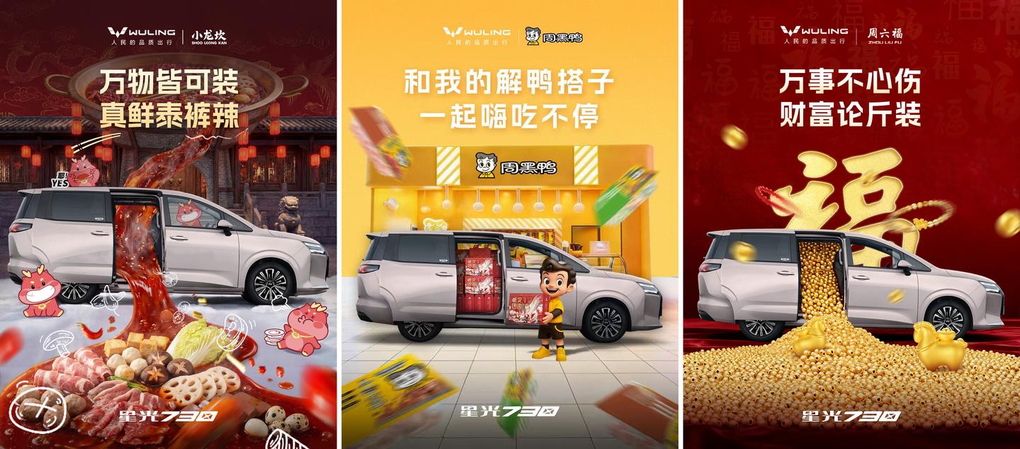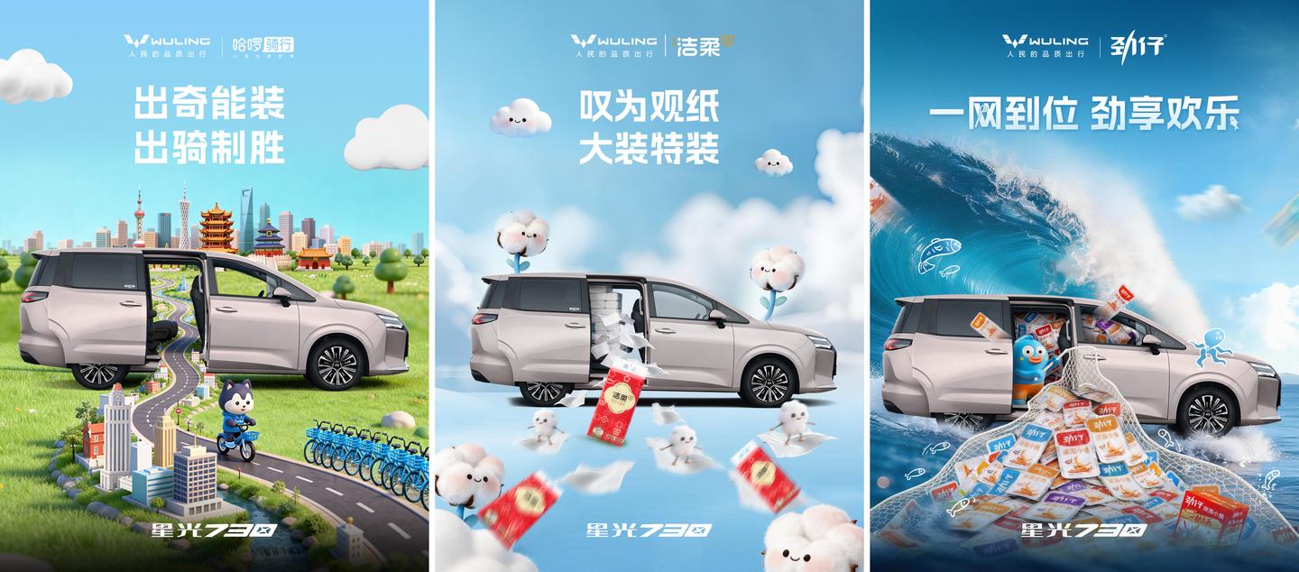 视觉层面,以星光730侧滑门为创意核心,为每家品牌设计专属联动海报,将品牌主打产品/IP与车型趣味融合,既体现五菱产品特色,又保留各品牌视觉辨识度。文案层面,深度贴合联动品牌调性、核心产品与出圈热点,打造自带传播力的趣味文案,如卫龙的“解馋上不封顶 卫你永不断货”、中国邮政的“叮咚!您有一封来自国民的欧气快递,请锦鲤本人签收”等,紧扣“装载”主题,充满趣味性与互动性。