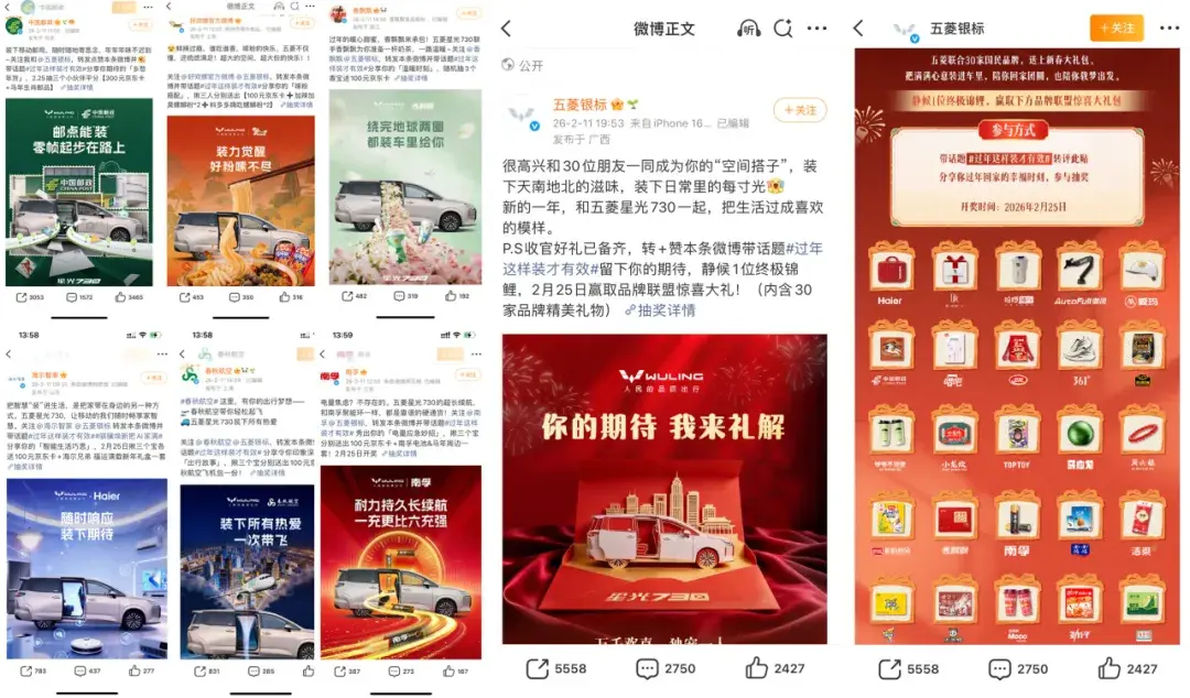 进入传播高潮期,30家蓝V矩阵式齐发1V1定制化联动海报,五菱品牌压轴登场,所有品牌同步集体转发形成强势“刷屏效应”;创意内容深度贴合各品牌调性,将星光730“大空间、侧滑门”核心卖点与年货装载场景无缝融合,生动演绎“万物皆可装”的产品主张。