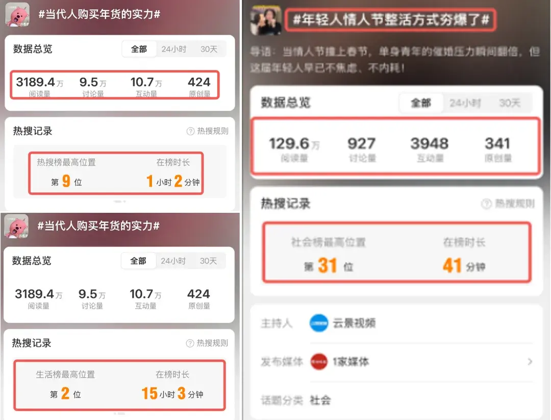 本次外围冲榜精准打造了两大核心话题,分别为 #当代人购买年货的实力# 和 #年轻人情人节整活方式夯爆了 #,两大话题各有侧重、相互呼应,覆盖了不同的用户群体和传播场景,实现了全网流量的最大化撬动。