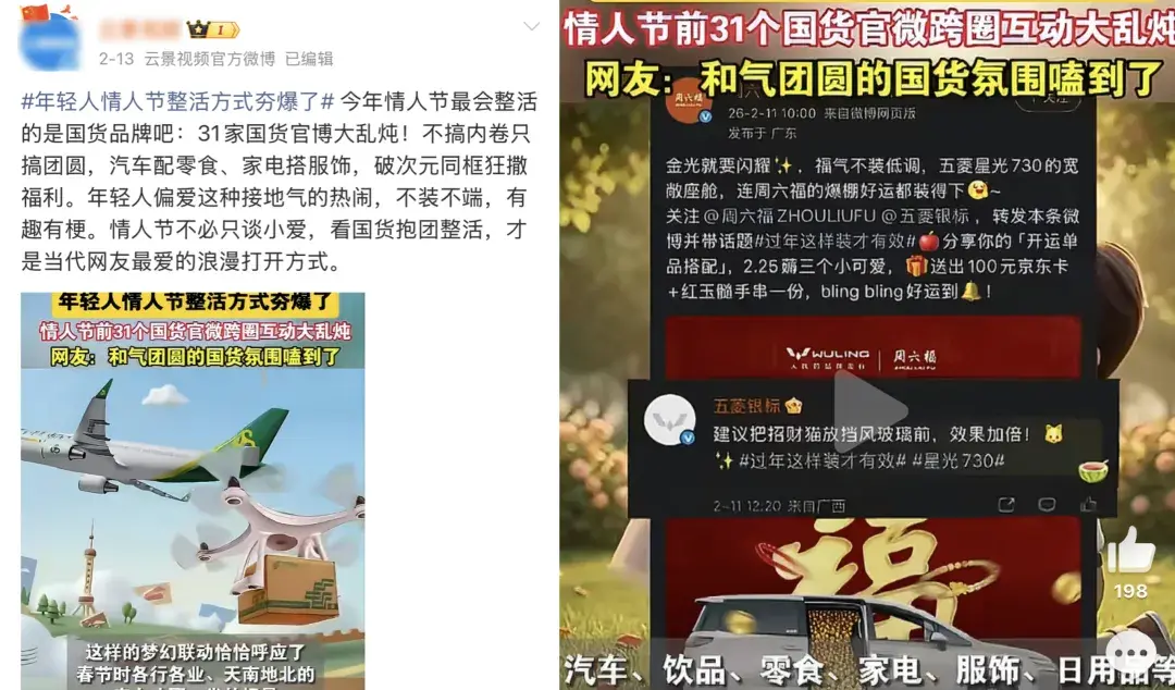 紧扣情人节节点,精准戳中年轻人反内卷、求松弛的节日态度,摒弃了传统情人节的仪式攀比,以30家国货官微跨圈互动大乱炖的形式,打造出接地气、有梗、有趣的传播内容,成为年轻人喜爱的节日打开方式。该话题自带强大的社交传播力,用户自发整活分享,而星光730以高颜值大空间、灵活适配各种出行场景的优势,轻松融入用户的生活实拍内容,实现无痕种草。同时,话题覆盖了情侣、单身、好友等多元人群状态,打破了节日传播的人群边界,让星光730成为年轻人过节的百搭出行搭档,进一步扩大了产品的受众范围。