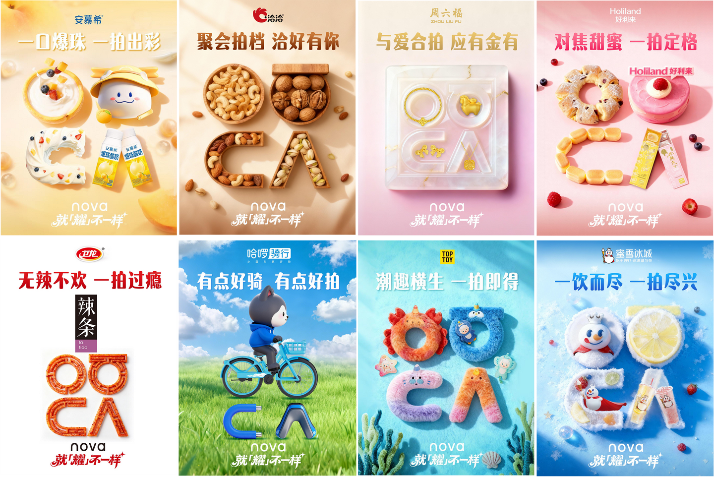 采用“AI 技术提效+人工专业把控”的创作模式,为10家联动品牌量身打造高契合度、高创意性的定制海报,既保证出品效率,又坚守品牌视觉调性与创意品质,实现技术与创意的双向融合。