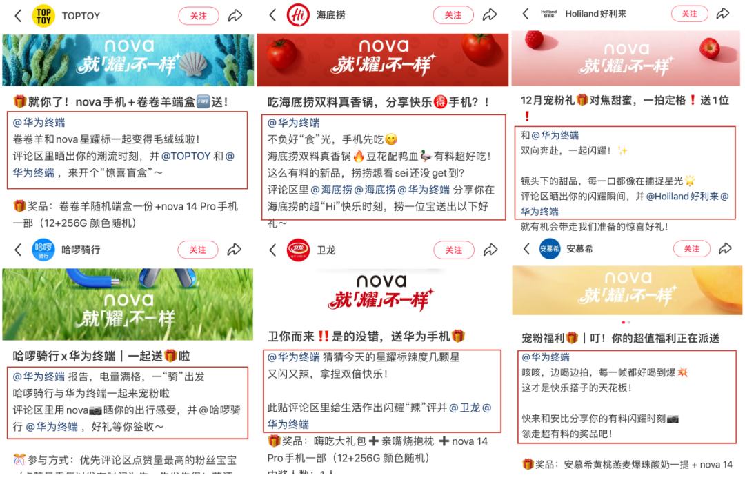 1、跨域资源整合,实现生态破圈:打破行业与品牌边界,联动快消、食品、珠宝、出行等多品类 10 家优质蓝 V 品牌,构建“品牌+平台+用户”的多元生态联动体系。不仅实现粉丝资源互通、流量叠加,更借助不同圈层的用户群体,让华为nova的品牌符号与年轻态度突破单一圈层限制,从手机行业延伸至更广泛的年轻消费场景,让星耀标符号与品牌理念触达更多潜在用户,破解传统营销的圈层壁垒。