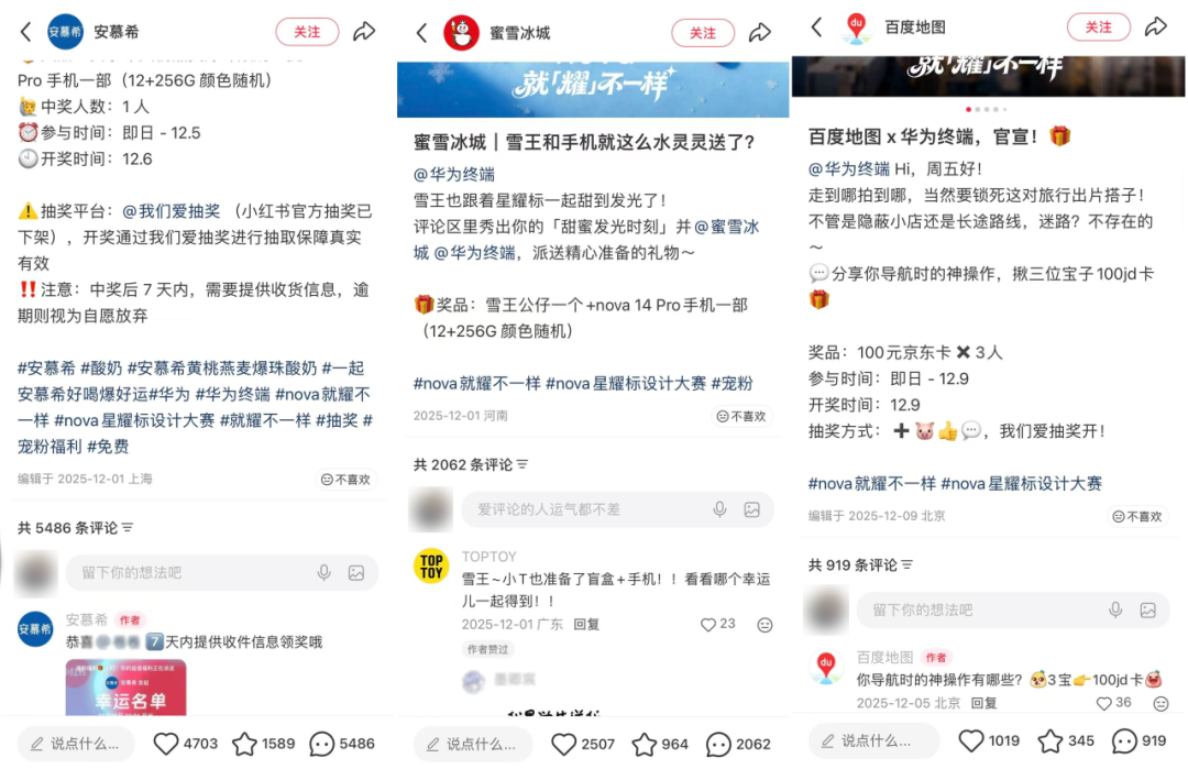 2、双向激励,撬动参与:以“物质激励+精神满足”双维度驱动用户参与,兼顾吸引力与情感共鸣,实现参与度与自传播率双提升。物质层面,推出华为nova 14 Pro、品牌联名周边等重磅福利,大幅降低参与门槛,直接提升用户参与意愿;精神层面,开放优秀作品品牌官方渠道展示机会,精准契合年轻人自我表达、追求价值认同的核心需求,充分激发用户创作热情与自发传播积极性。