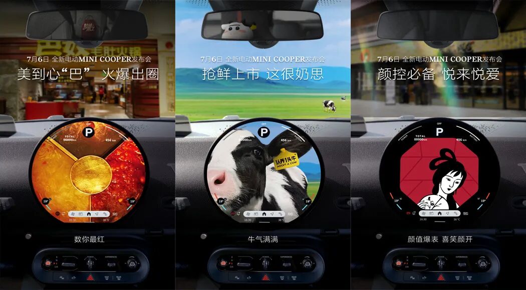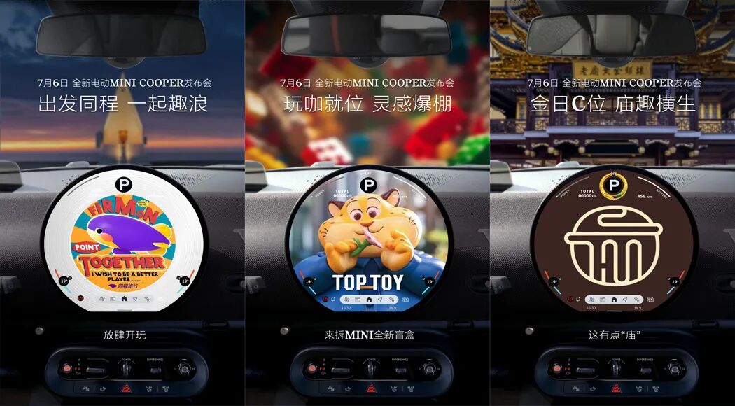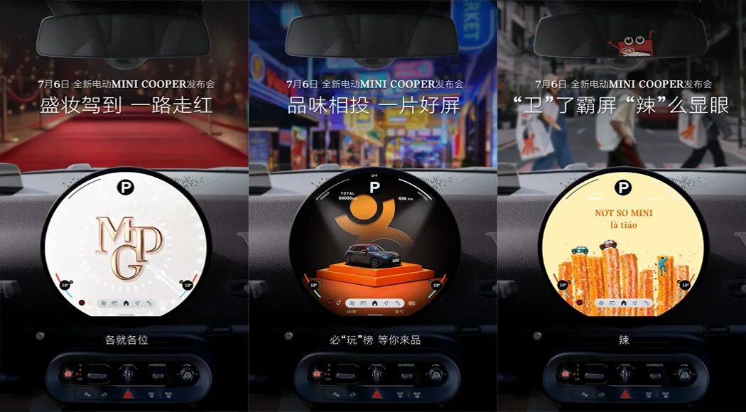 一系列精心设计的海报,巧妙地将MINI COOPER车内标志性的圆形屏幕作为视觉焦点,与21家品牌最具辨识度的"视觉基因"融为一体,比如中国邮政的邮筒、卫龙的经典款辣条、茶颜悦色标志性执扇古风仕女图等等,两者相结合,既突出MINI的英伦风格与科技感,又展现经典品牌的文化底蕴。