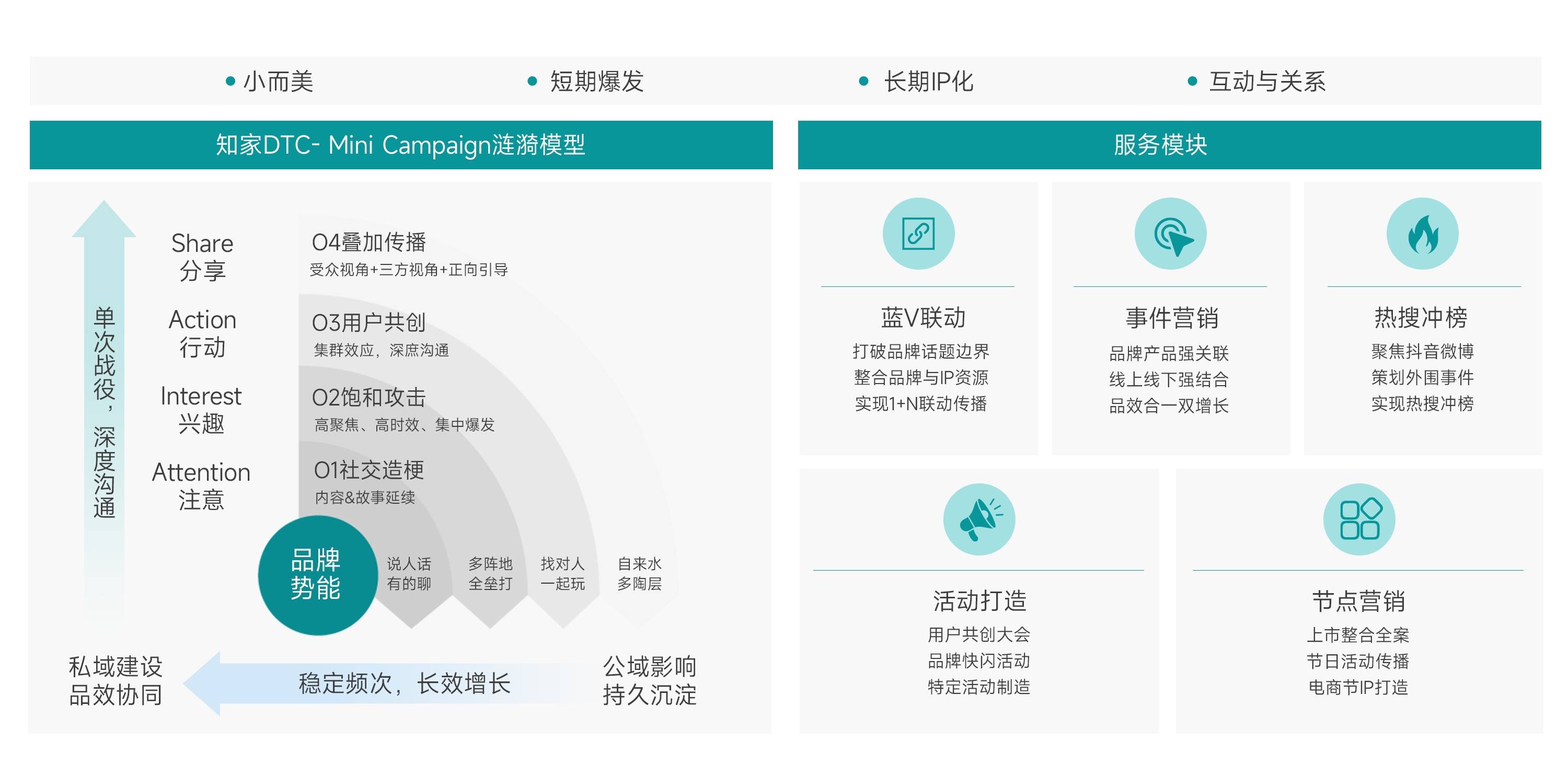 知家DTC是行业内“品效销”全链路一体化方法论的首创者,领军中国DTC营销服务领域,以“缩短客户转型创新周期”和“降低客户创新变革成本”为运营核心引领行业创新,为客户提供获客矩阵营销提效、超级用户运营、Mini-Campaign、超级门店打造、AI+内容中台、DTC营销增长陪跑六大核心业务,助力客户实现DTC营销模式创新。在汽车行业及大消费品行业提供全方位的专业“AI+品效销合一”的全链路数智化营销运营服务。