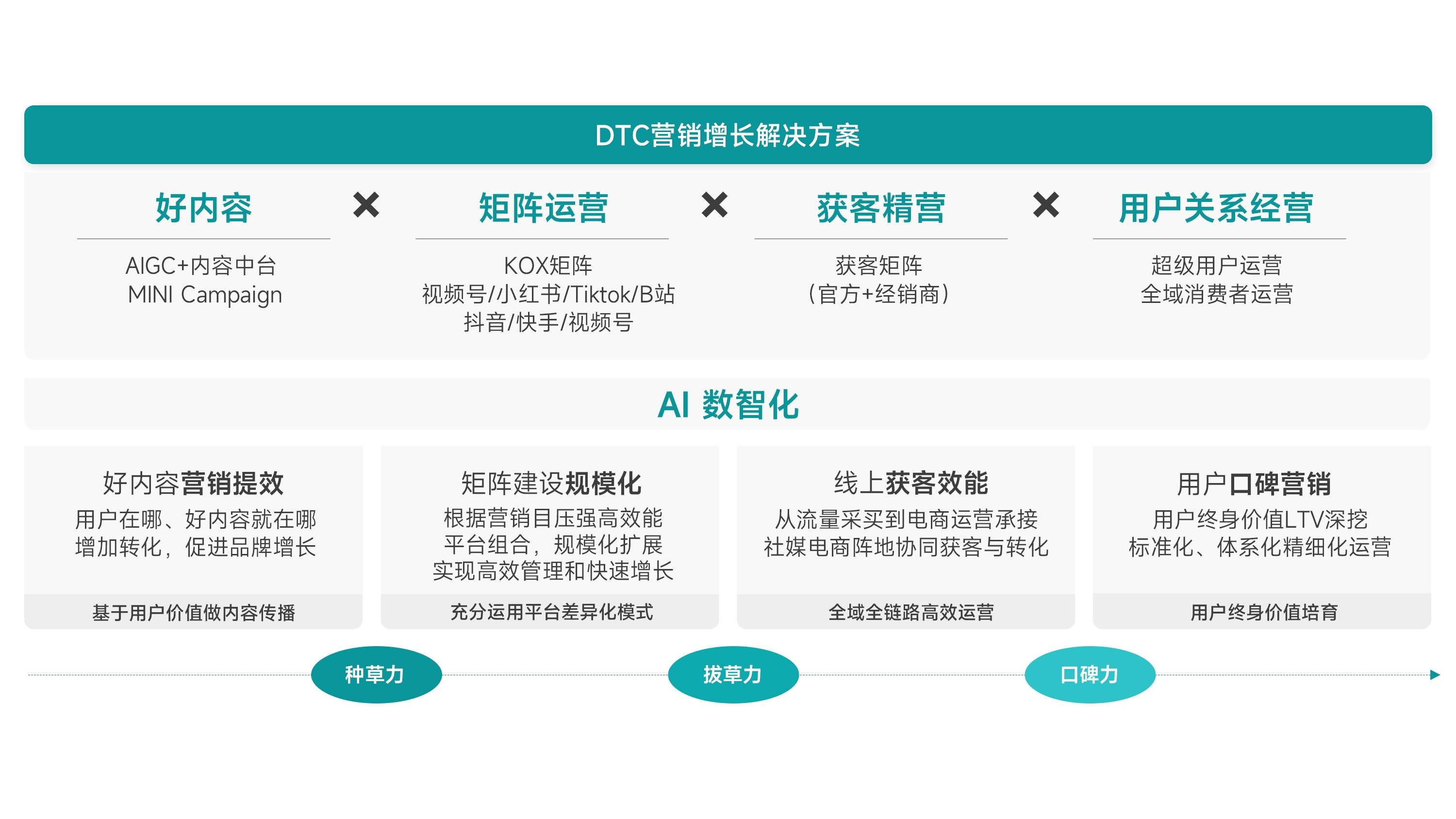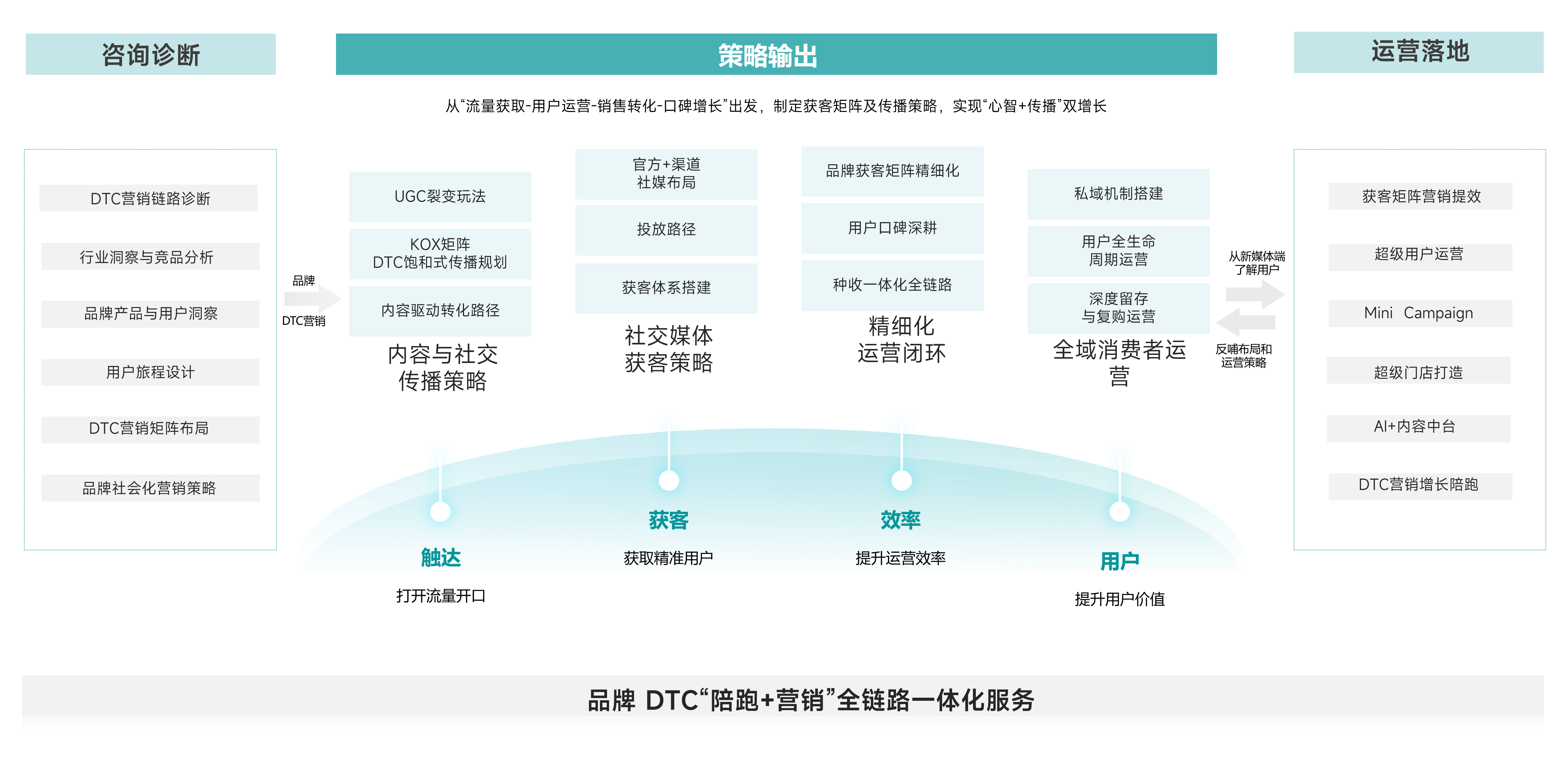 数字经济浪潮下,品牌营销需求已从单点执行升级为多元化、个性化、一体化的全链路服务。知家 DTC 前瞻性构建的全链路营销服务体系与 “品效销合一” 的核心解决方案,恰好精准契合了这一行业发展趋势 —— 通过整合策略咨询、内容传播、媒介投放、私域运营、直播转化、KOX矩阵等全场景能力,打破营销环节的碎片化壁垒,为品牌打造从声量提升到业绩增长的闭环路径,助力品牌在复杂多变的市场环境中构筑核心竞争优势,实现可持续的高质量增长。