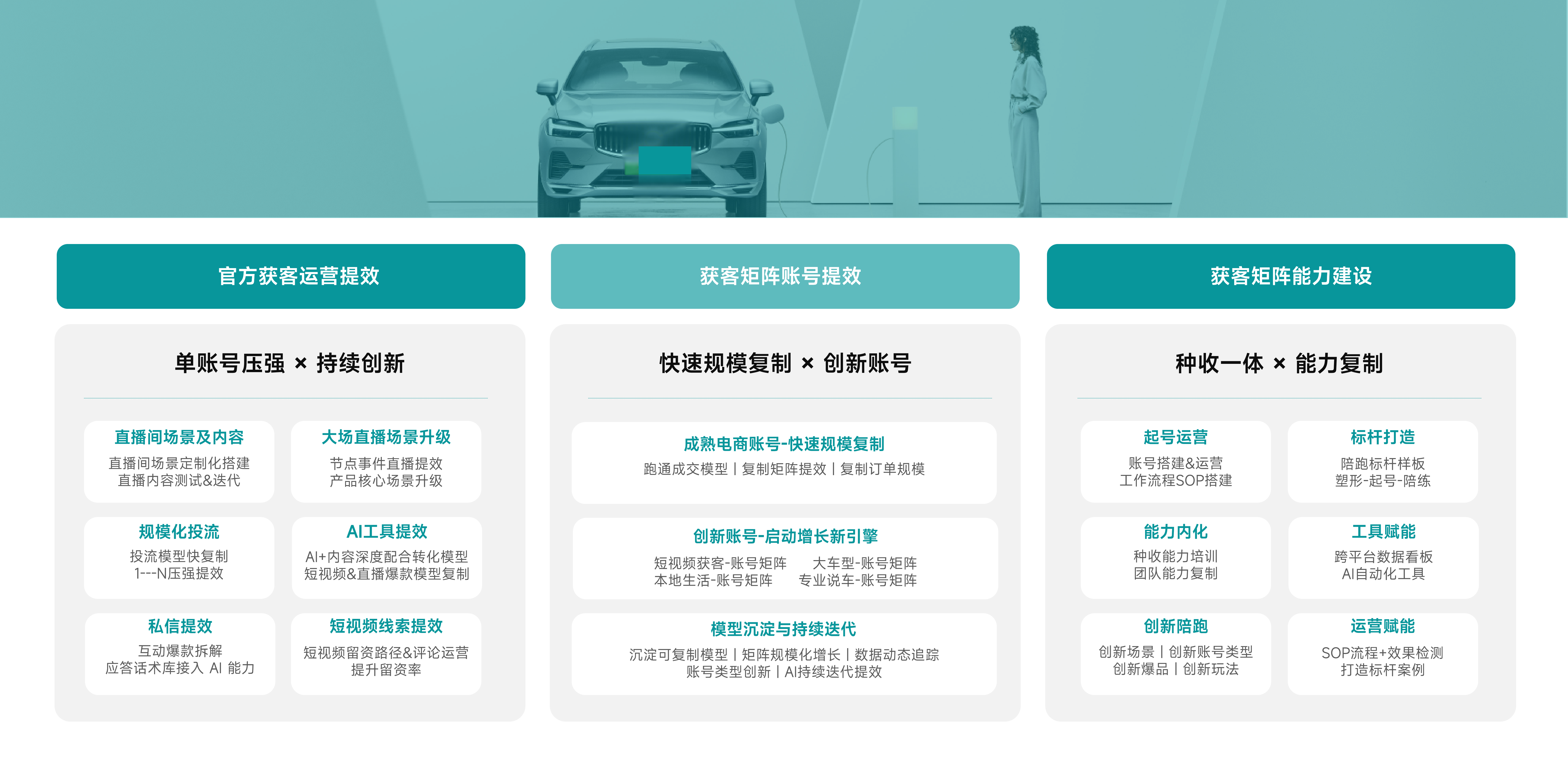 作为巨量引擎汽车生态重要合作伙伴以及字节跳动官方推荐的运投一体服务商,知家DTC同时拥有巨量引擎综合代理商、巨量千川服务商、巨量引擎营销科学中级服务商、巨量引擎汽车行业投播一体优质代理商等多项权威认证,形成了从策略到投放、从数据到科学的全链路服务能力,为客户提供高效、精准、可信赖的整合营销解决方案。
