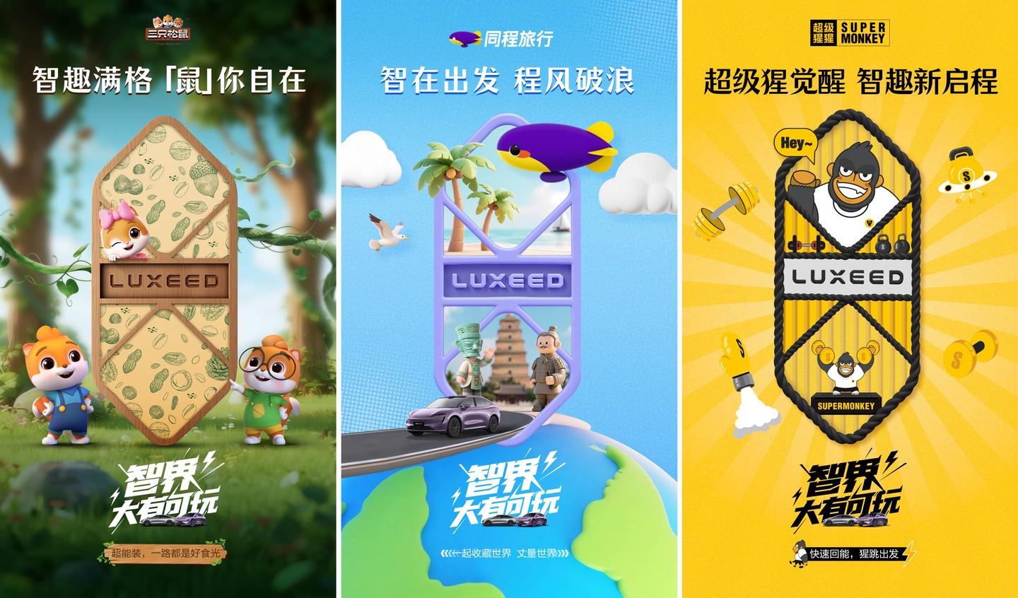 我们将智界汽车全新LOGO与各联动品牌主打产品/IP做创意融合,1v1设计定制海报,使用平面、3D模型、手绘等多元风格制作视觉内容。