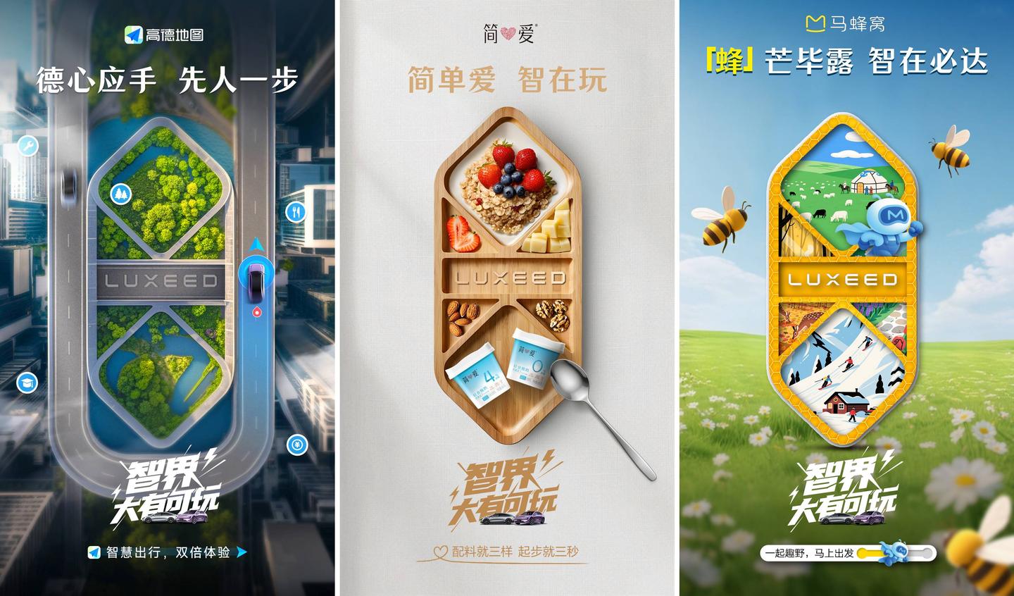 创意解释:马蜂窝,让年轻人从不同视角重新发现世界;智界,以智慧科技重新定义豪华出行,当探索的渴望遇上无界的驾驭,每一次出发,都是意料之外的惊喜。